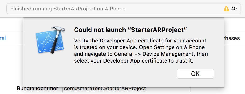 Hit that play button! You’ll see Xcode do a build and compile, which may take a bit. When its successfully completed, the app will appear on your phone. But you may see the following popup in Xcode.