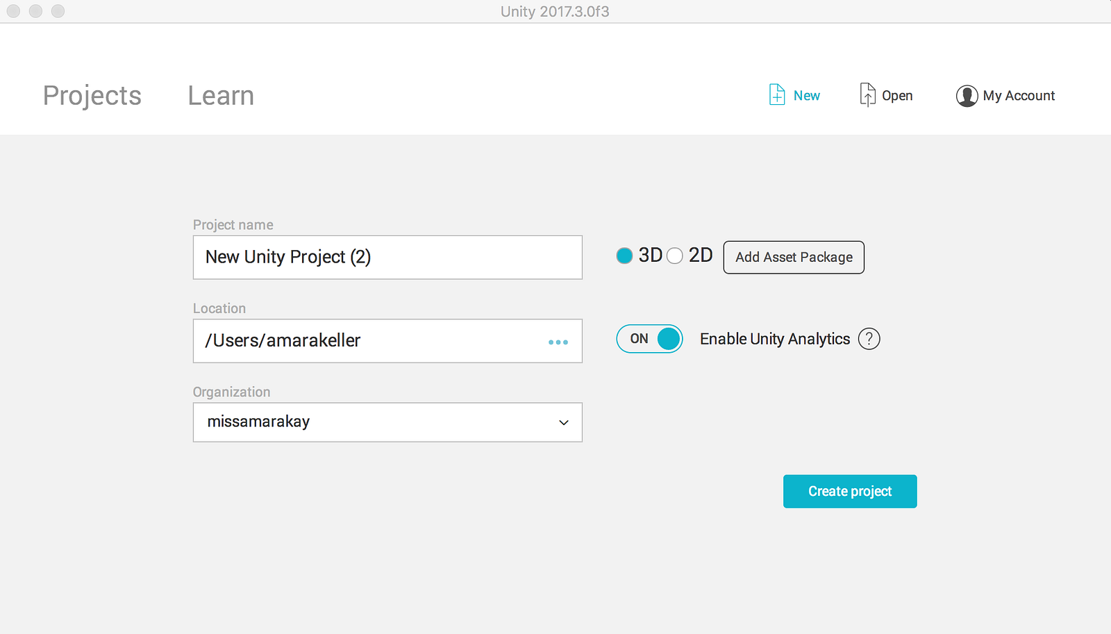 Name your project something interesting and put it somewhere that makes sense for you. In the process of downloading Unity and getting a personal license, you should have created an account.