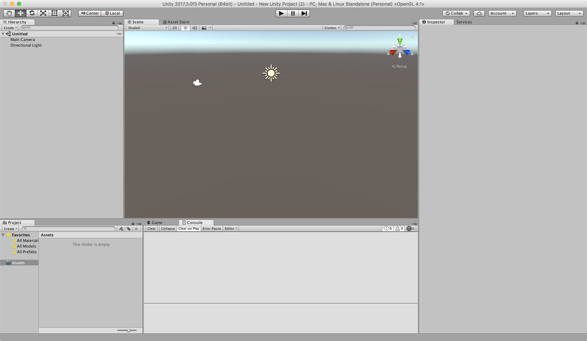 A shiny new project with nothing in it will load before your very eyes. The layout may not look like mine, but see if you can find the tabs and sections and put them in a similar layout. This was helpful when I followed my first video on the Unity Editor.