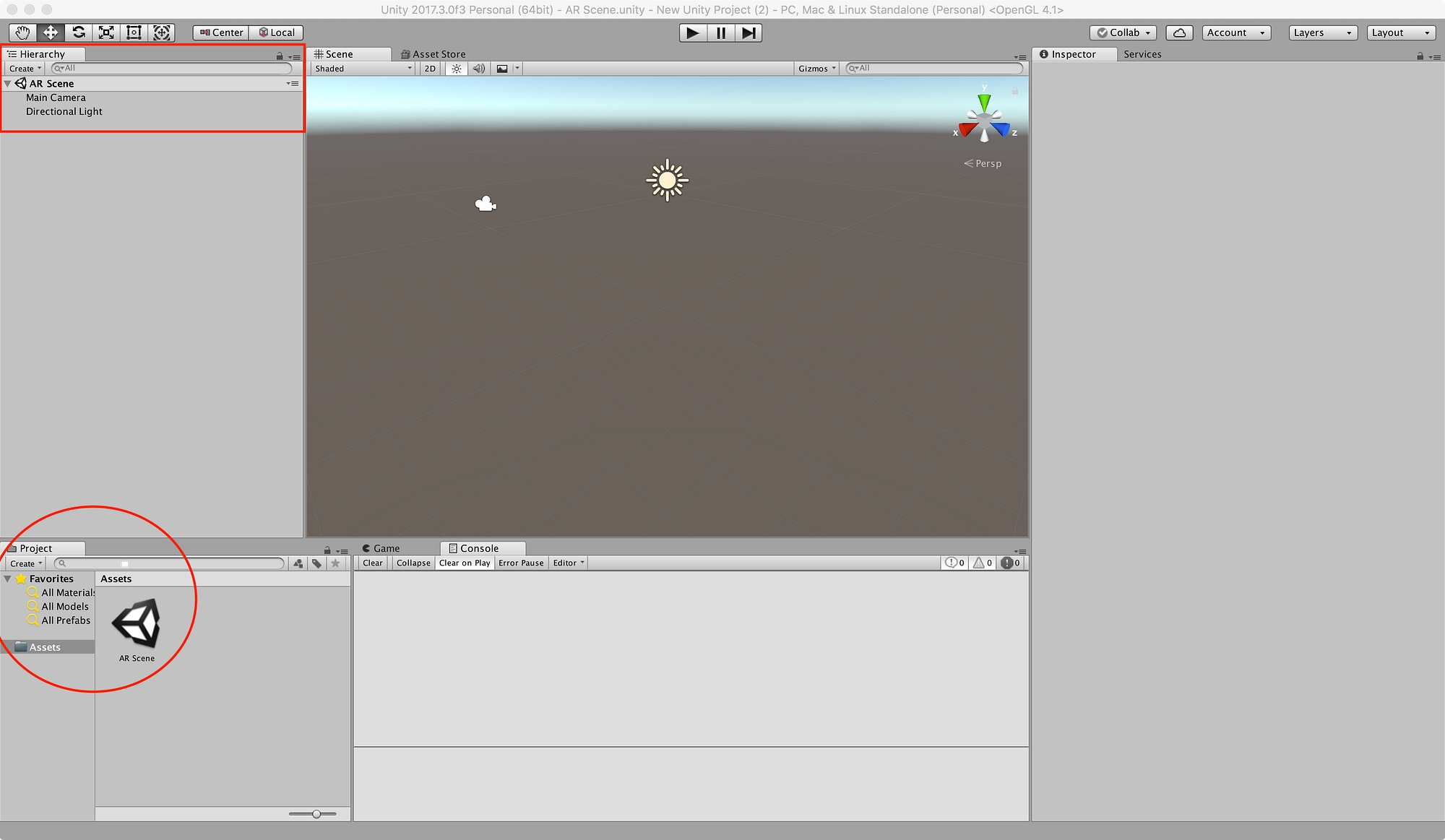 I named my scene “AR Scene” which you can see in both the Hierarchy at the top and the Project at the bottom.