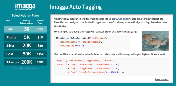 Imagga is a prominent company that develops and offers technologies, services, and online tools for visual image recognition, with technology that includes state-of-the-art machine learning approaches that allow it to be trained in the identification of various visual objects and concepts. In this post we would like to introduce you to a new add-on for Imagga's automatic image tagging capabilities, fully integrated into Cloudinary's image manipulation and management pipeline.